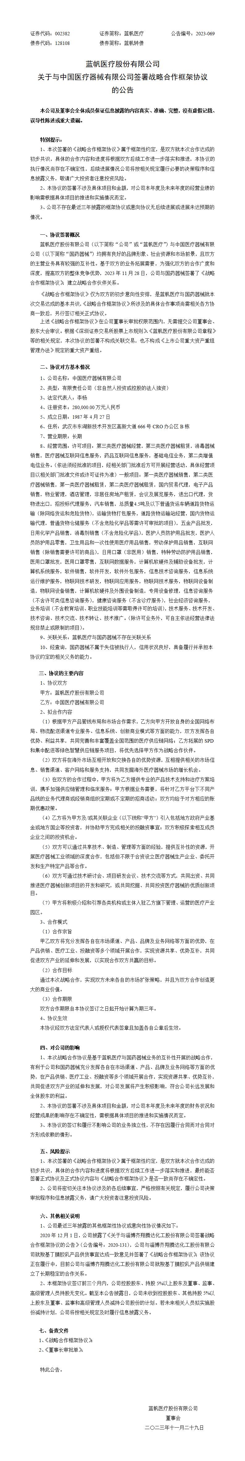 关于与中国医疗器械有限公司签署战略合作框架协议 的公告