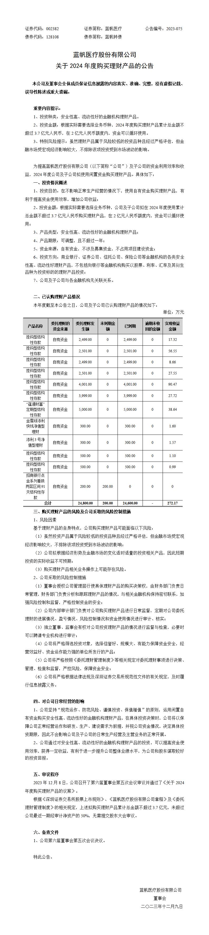 关于2024年度购买理财产品的公告