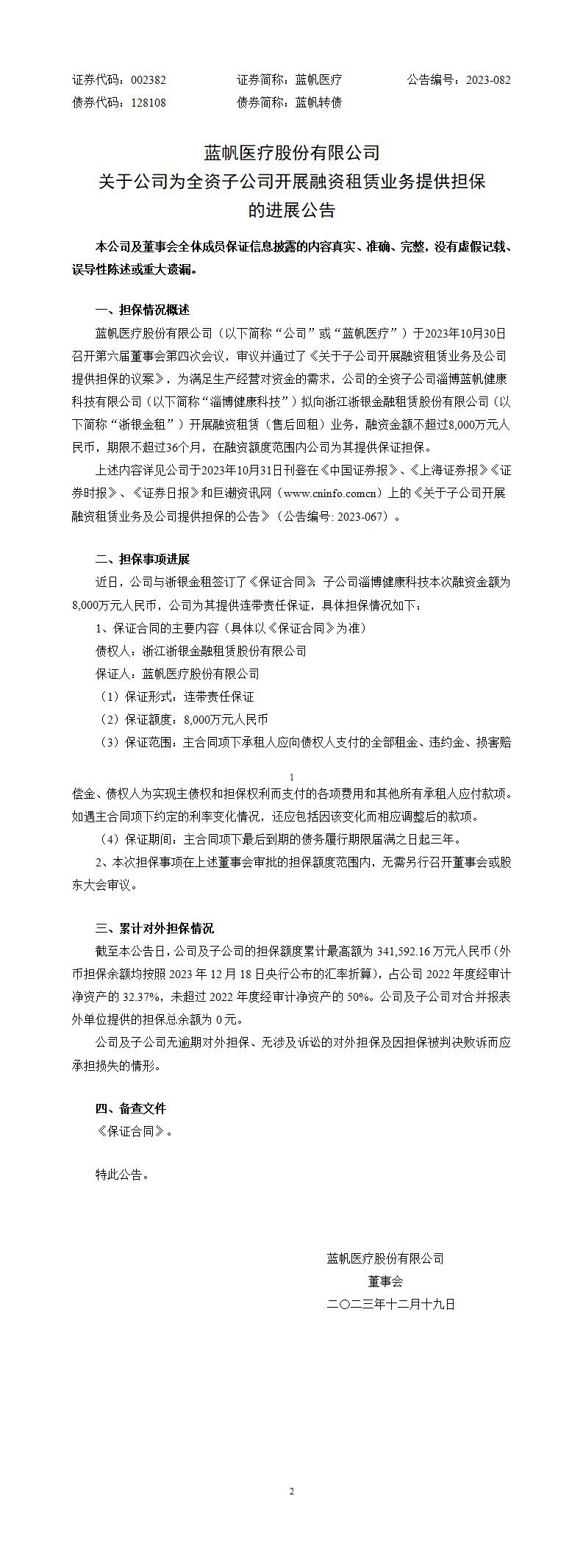 关于公司为全资子公司开展融资租赁业务提供担保 的进展公告