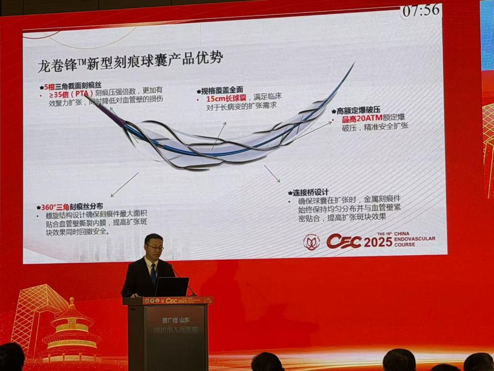 随后,曹广信教授(潍坊市人民医院)分享了《刻痕球囊在下肢动脉复杂病变的应用体会》。他结合具体病例,阐述了龙卷锋™刻痕球囊在下肢复杂病变治疗中的重要价值。龙卷锋™采用独特的5根三角锋利金属刻痕丝,实现360°螺旋全覆盖,具备更广的刻痕面积与更强的扩张压强倍数,在有效减少夹层发生率的同时,实现优异的管腔准备效果,为复杂性狭窄闭塞病变提供了新的治疗选择。