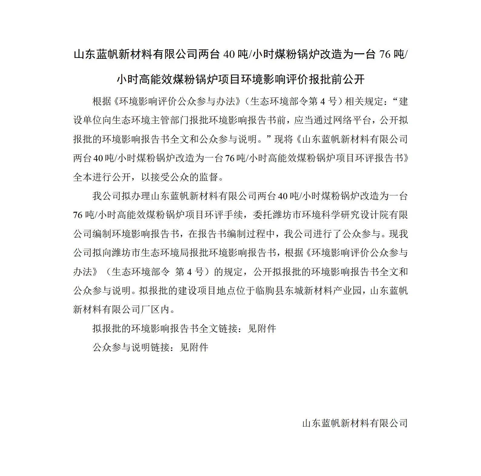 山东bob电竞竞技 新材料有限公司两台40吨/小时煤粉锅炉改造为一台76吨/小时高能效煤粉锅炉项目环境影响评价报批前公开